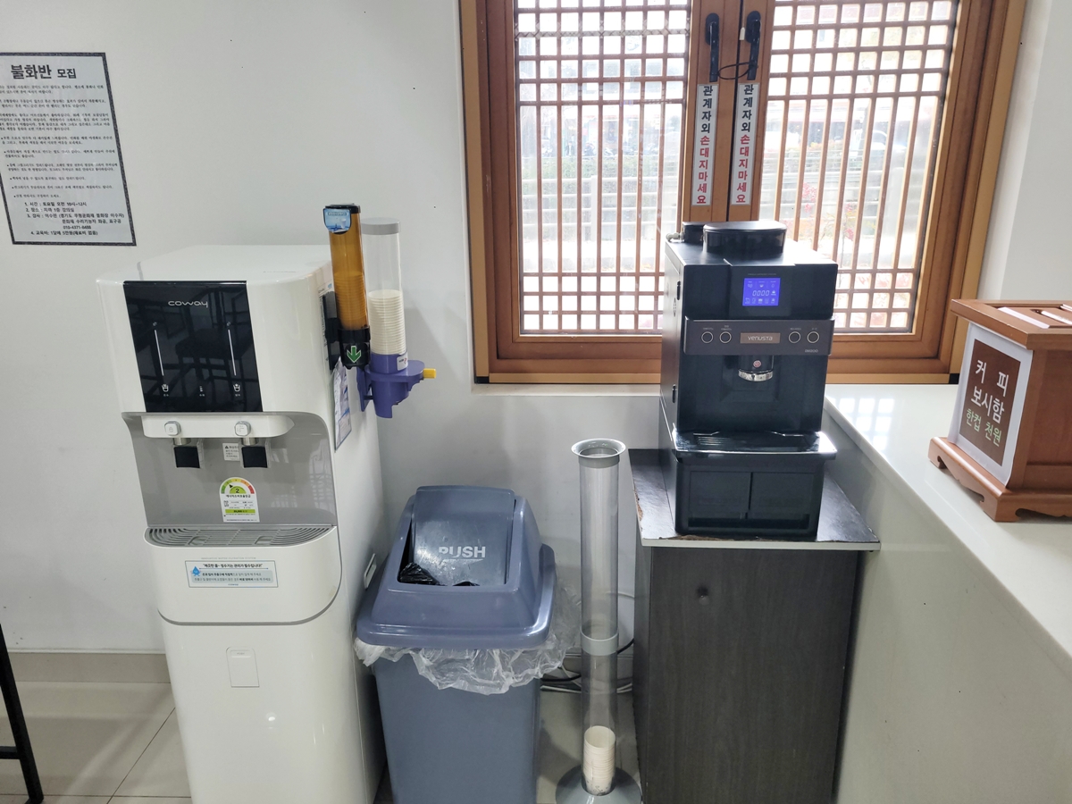 수원사로 들어서면 선열당 전각에 신도휴게실이 있습니다. 이곳에 커피 등 음료를 마실 수 있는데요, 커피 보시함이 있어 한 컵에 1천 원을 내고 마시면 됩니다. 수원사에 갔을 때 밖에 쌀쌀했는데, 여기서 따뜻한 커피 한잔 모시니 몸이 녹는 듯했습니다.