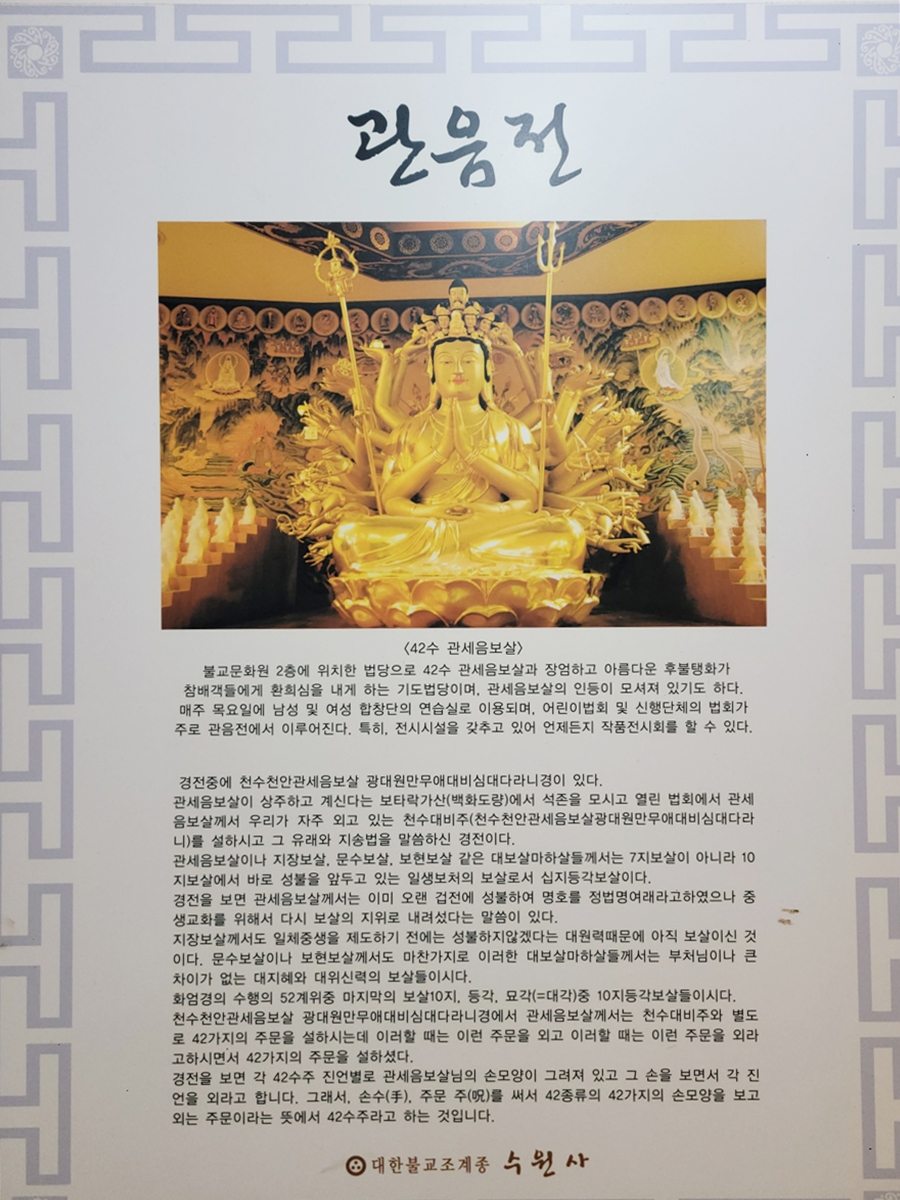 안내문에 따르면, 이 42수는 관세음보살의 손 모양을 따라 42가지의 손으로 변하면서 그 수에 연결된 42가지의 주문을 외우며 원하는 바를 이루어준다고 합니다. 수원사 관음전에서는 매주 목요일에 합창단의 합주실로도 이용되는 등, 신행(信行)과 문화가 공존하는 공간임을 보여줍니다.